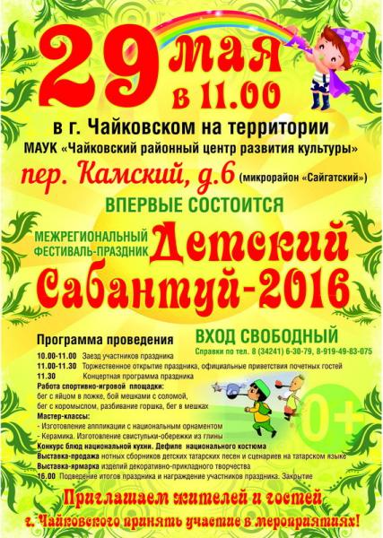 Впервые в г. Чайковском на территории МАУК «Чайковский районный центр развития культуры» пер. Камский, д.6 состоится Межрегиональный фестиваль-праздник «Детский Сабантуй-2016», участниками которого станут детские национальные творческие коллективы и солисты Пермского края, Башкирии, Удмуртии, Татарстана. В программе праздника массовые игровые и спортивные мероприятия, концертная программа, мастер-классы, дефиле национального костюма, выставка-ярмарка изделий декоративно-прикладного творчества и др..