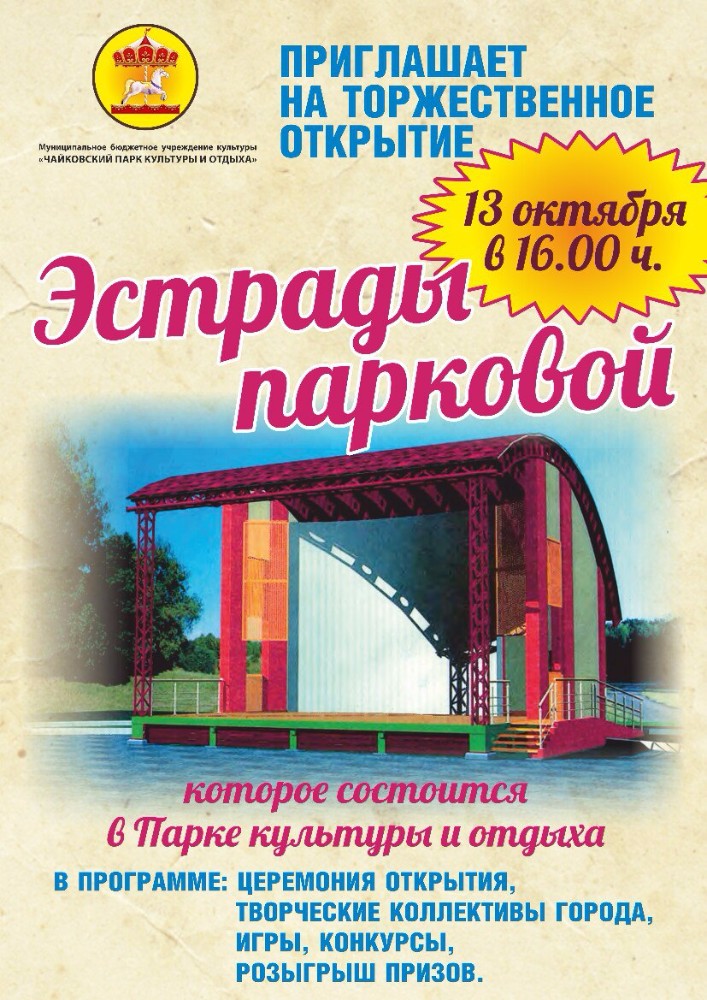 7 октября в Чайковском парке культуры и отдыха должно было состояться торжественное открытие эстрады парковой. Но погода внесла свои коррективы и мероприятие организаторы перенесли на другую дату. Теперь уже известно, что официальное открытие эстрады парковой запланировано на пятницу, 13 октября. Начало в 16.00. В программе выступление коллективов города, танцевальный фитнес «Zumba», игры и конкурсы, а также розыгрыш призов.