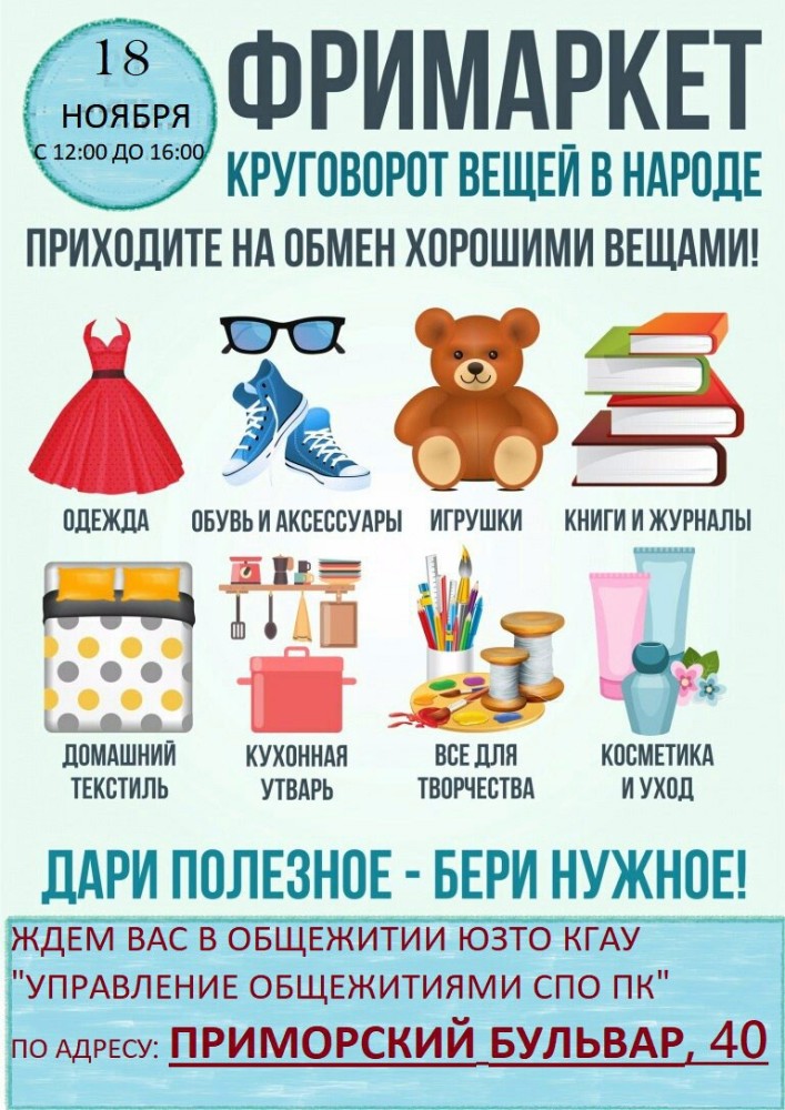 Желающих отдать свои ненужные хорошие вещи и просто интересно провести время будут ждать с 12:00 до 16:00 в общежитии ЮЗТО КГАУ «Управление общежитиями СПО ПК» (ул. Приморский бульвар, 40).