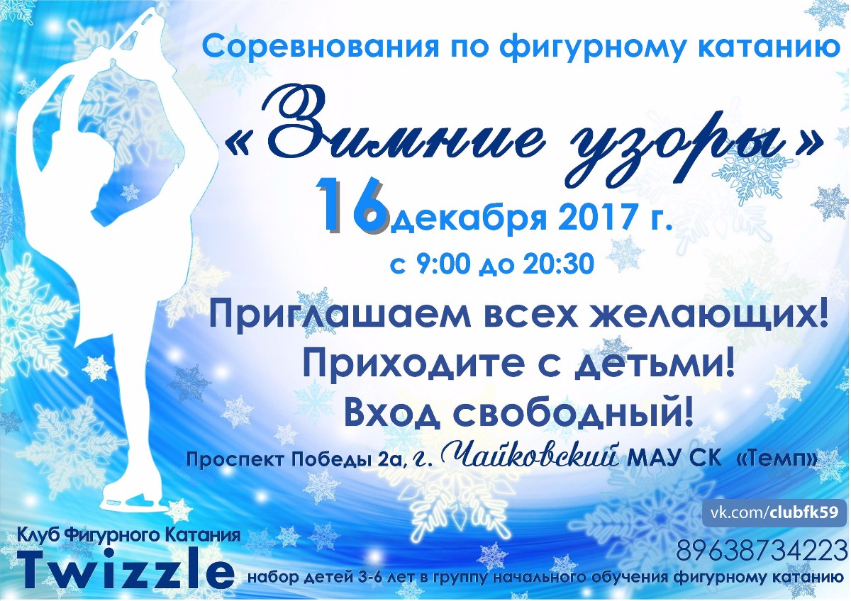 Уже в эту субботу, 16 декабря, впервые в Чайковском состоятся открытые соревнования по фигурному катанию «Зимние узоры». На лёд выйдут юные фигуристы от 4 до 15 лет.