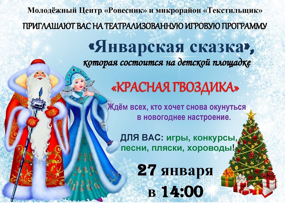 Совет микрорайона «Текстильщик» и Молодёжный центр «Ровесник» приглашает юных жителей Чайковского с мамами и папами на праздник «Январская сказка». Местом проведения театрально-игровой программы «Январская сказка» станет детская площадка «Красная гвоздика» в микрорайоне «Текстильщик» города Чайковский.