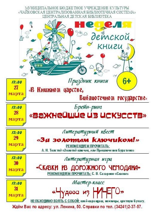 С 27 по 31 марта юных читателей ждут увлекательные мероприятия в рамках акции, которые пройдут в Центральной детской библиотеке (ул. Ленина, 50), а также в библиотеках №№ 3 (ул. Советская, 4), 7 (ул. Декабристов, 19), 9 (пр. Победы, 16).