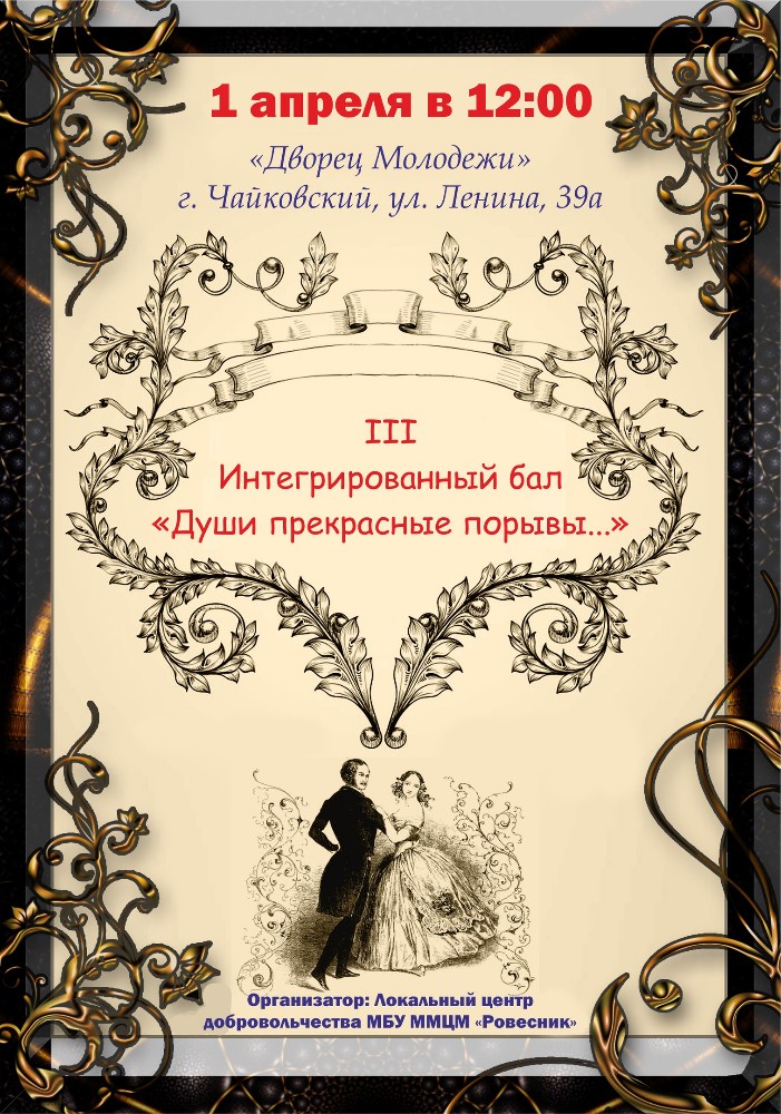 В первый день апреля в Чайковском в третий раз состоится Интегрированный бал «Души прекрасные порывы...». Участниками бала станут дети и молодые люди с разным уровнем физических возможностей, а также волонтёры. Всего на паркет выйдут около 100 человек, из них 40 человек с ограниченными возможностями здоровья.