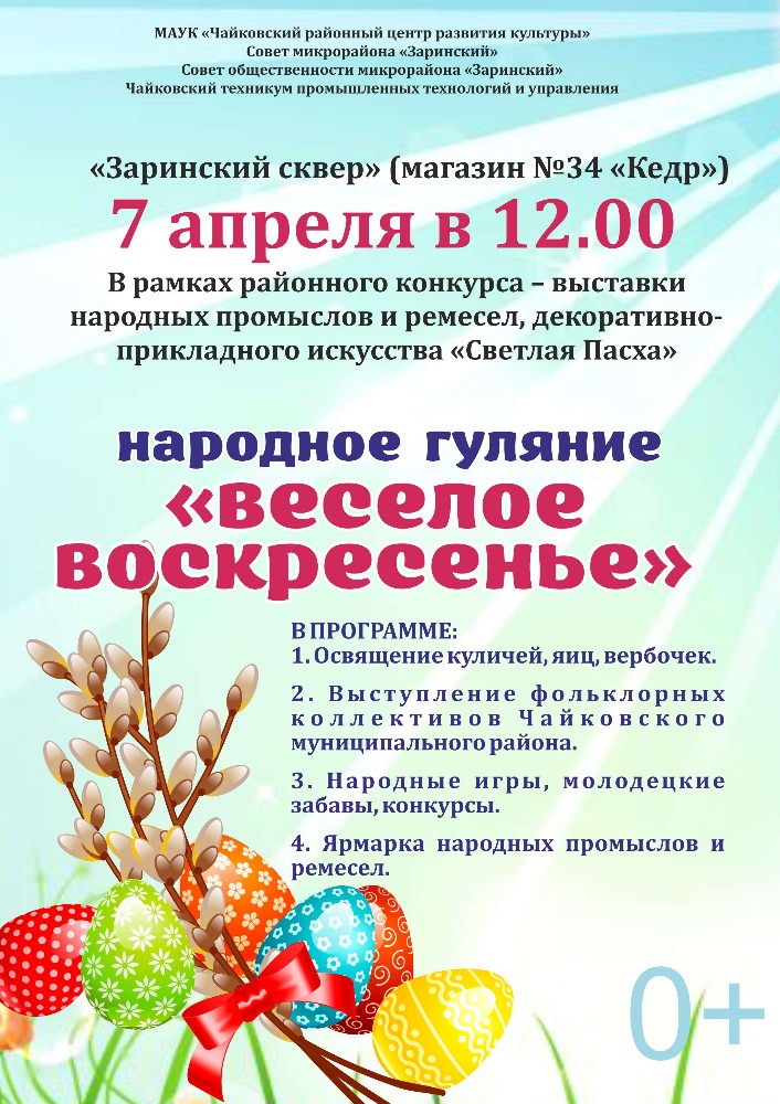 Одной из значимой составляющей праздничного пасхального цикла – гуляние детей, молодёжи и старшего поколения. К сожалению, за последние десятилетия утратились традиции народного праздничного гуляния, связанного с ориентированием на семью, семейные традиции. Специалисты МАУК «Чайковский районный центр развития культуры», совместно с Советом микрорайона «Заринский» и ЧТПТиУ проводят уже второй раз народный праздник «Весёлое воскресенье».