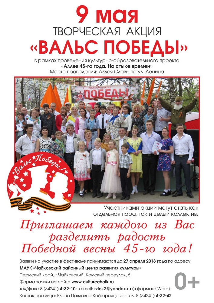 Акция «Вальс Победы» стартовала в 2015 году в рамках творческого проекта Марафон-благодарность «70 дней до Победы». В 2018 году четвёртый раз участники акции разделят радость Победной весны 45-го года. МАУК «Чайковский районный центр развития культуры» приглашает чайковцев закружить в «победном вальсе» 9 мая.