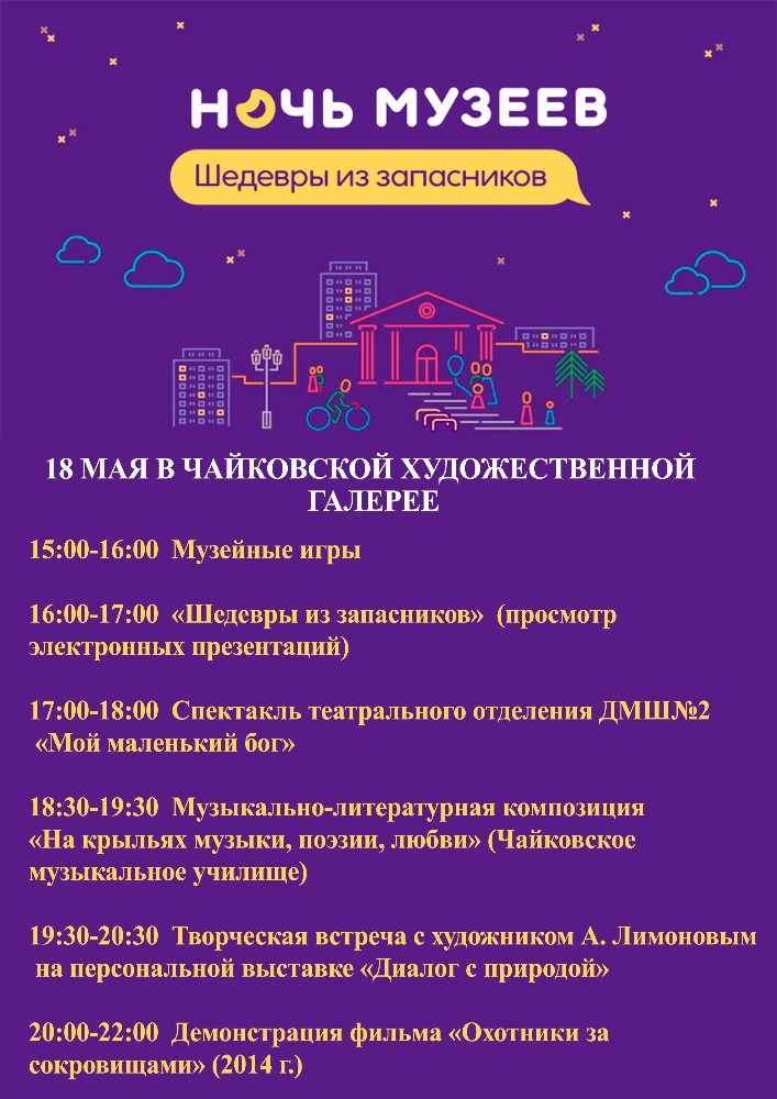 «Ночь музеев» — единственное время в году, когда множество арт-пространств открыто для посещений до поздней ночи. Работать дотемна будет и Чайковская художественная галерея. Хранители галереи подготовили для всех участников акции музейные игры, спектакль, встречу с художником А. Лимоновым и многое другое.
