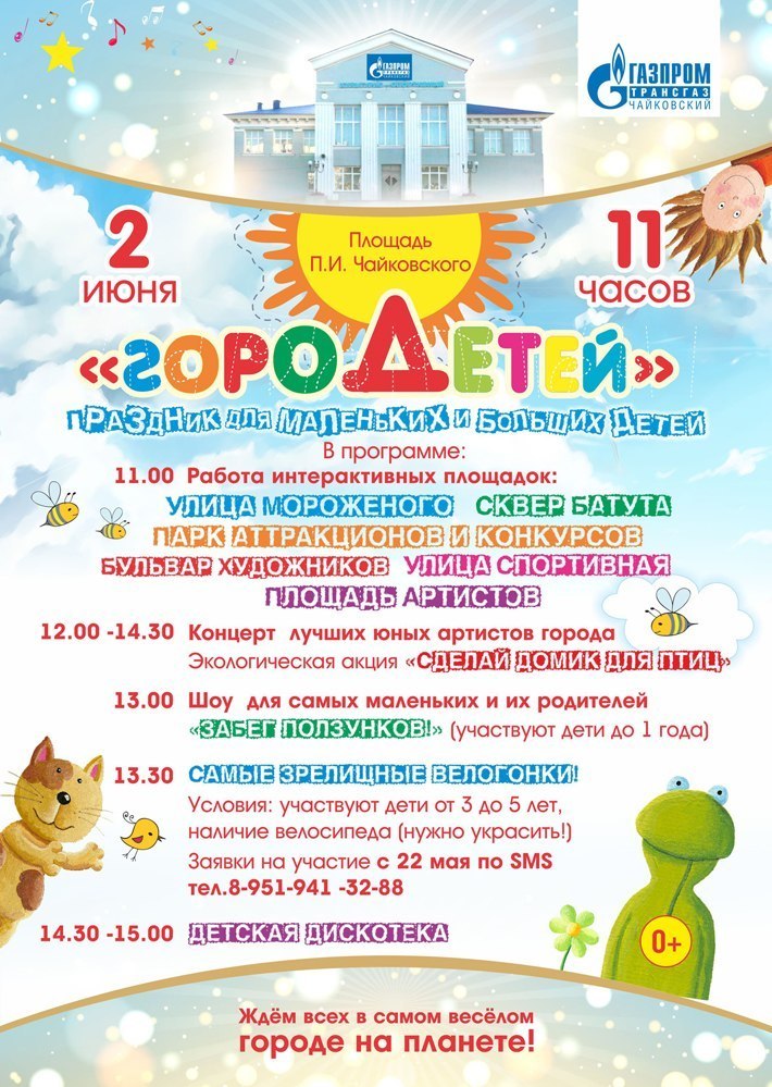 2 июня юных чайковцев с 11:00 ждут на площади П. И. Чайковского. Здесь будут работать интерактивные площадки: «Улица мороженного», «Сквер батута», «Парк аттракционов и конкурсов», «Бульвар художников», «Улица спортивная», «Площадь артистов». Также в программе - весёлые конкурсы, экологическая акция «Сделай домик для птиц», интересное представление с лучшими юными артистами города, подарки, сюрпризы и праздничная торговля. Кроме того, в рамках мероприятия на площади П.И. Чайковского состоится шоу для самых маленьких и их родителей «Забег ползунков», в котором смогут поучаствовать малыши до 1 года.