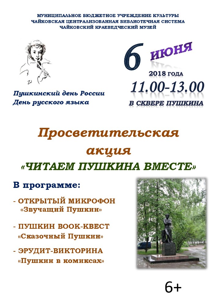 По традиции Чайковский не останется в стороне от празднования. В этот день в сквере у памятника А. С. Пушкину в 11.00 состоится мероприятие «Пушкин book-квест», посвящённое Пушкинскому дню России.