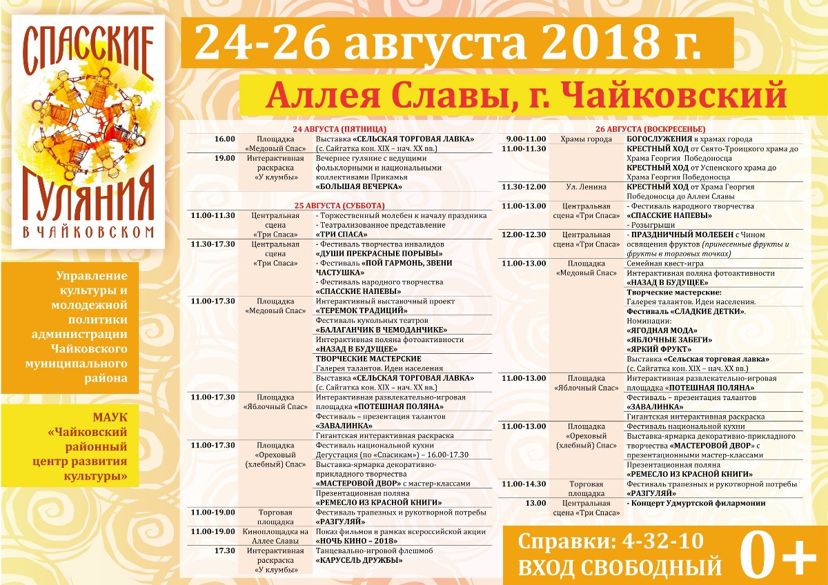 С 24 по 26 августа в Чайковском на Аллее Славы вновь пройдут Спасские гуляния. «Спасские гуляния в Чайковском» - это незабываемый праздник, развлекательные программы, мастер-классы и ярмарка! Это дегустация ароматного мёда, пышных яблочных пирогов и орехового варенья!