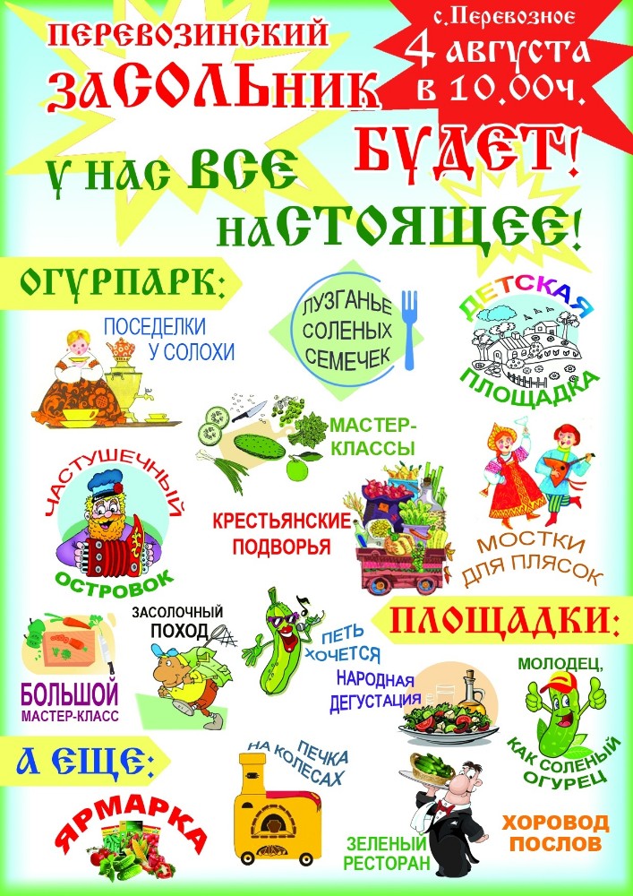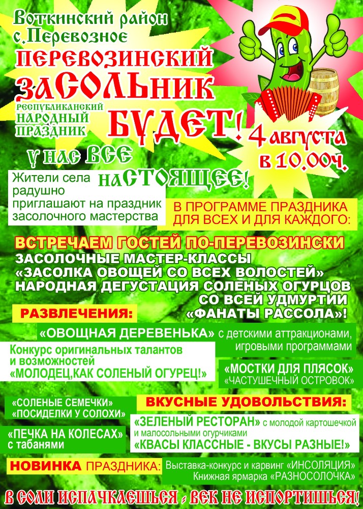 4 августа парковая зона села Перевозное уже традиционно превратится в раздольную разносольную ярмарку, куда съедутся делегации районов и городов Удмуртии, Пермского края. Официальное открытие праздника запланировано на 11.00, однако торговые ряды и мастер-классы начнут свою работу уже с 10:00.