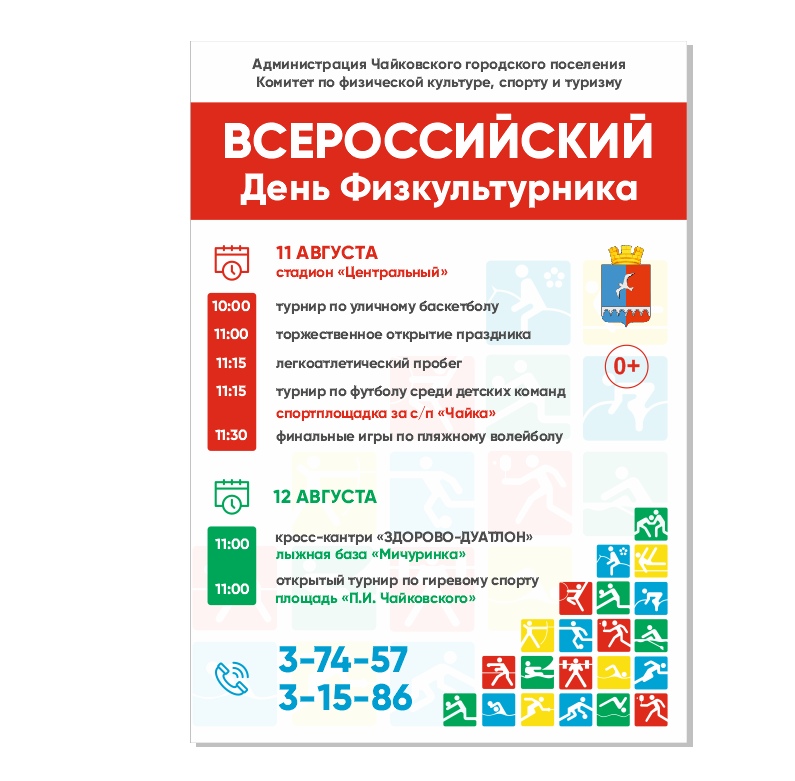 В предстоящие выходные, 11 и 12 августа, в Чайковском, как и по всей территории России, пройдут спортивные мероприятия, приуроченные к празднованию Дня физкультурника. Ежегодно этот праздник отмечается каждую вторую субботу августа.