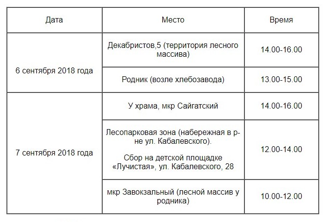 В пятницу, 7 сентября, экологические акции пройдут сразу в трёх микрорайонах: в Сайгатке у строящегося храма; на городской набережной в границах улицы Кабалевского; и в лесном массиве у родника в Завокзальном микрорайоне.