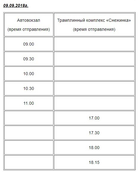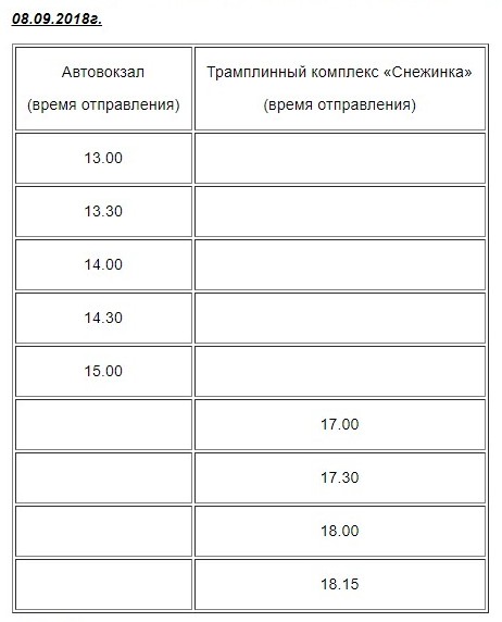 Добраться до ФЦП «Снежинка» можно на автобусе. Стоимость проезда по маршруту «Автовокзал – трамплинный комплекс «Снежинка» – 25 руб., по маршруту «Площадь Чайковского – трамплинный комплекс «Снежинка» – 20 руб. Расписание движения транспортных средств в таблице ниже.