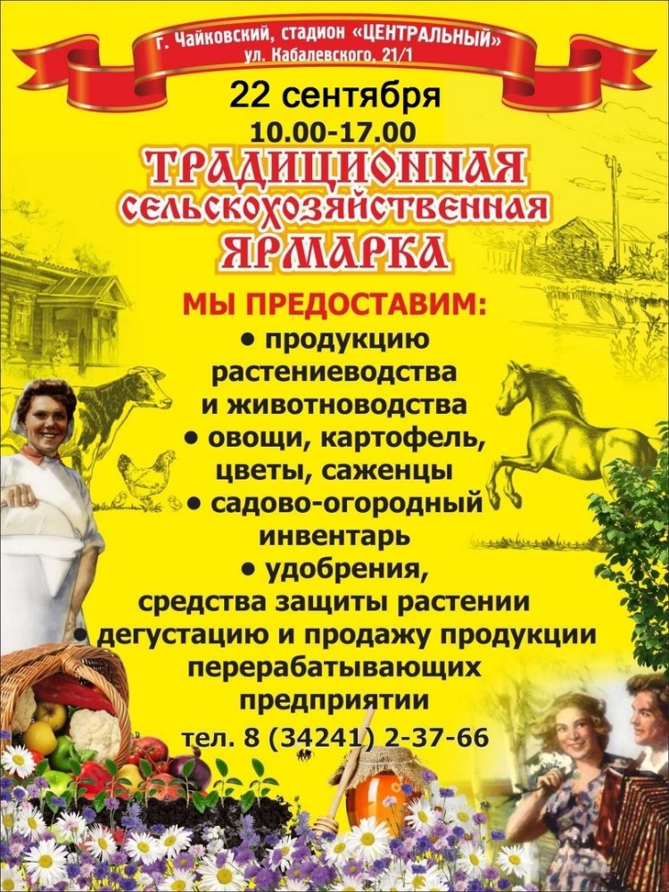 Жителей и гостей Чайковского приглашают на традиционную осеннюю сельскохозяйственную ярмарку. Стоит отметить, что подобное мероприятие проводится ежегодно уже более десяти лет и неизменно привлекает внимание не только горожан.