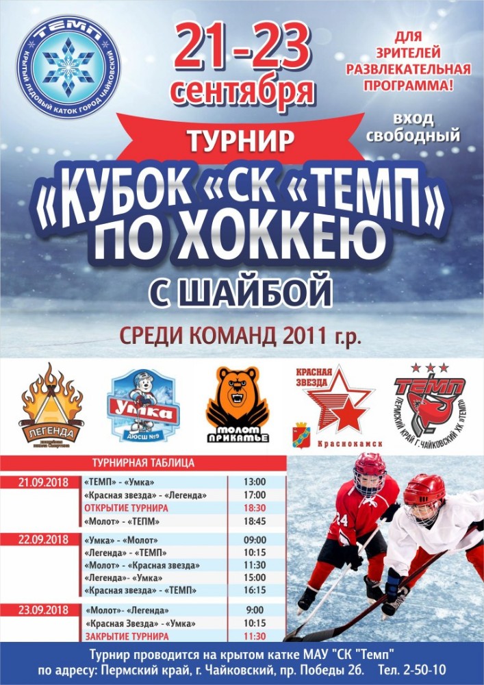 С 21 по 23 сентября на крытом ледовом кате «Темп» состоится турнир «Кубок СК «Темп» по хоккею с шайбой среди команд 2011 г. р. В соревнованиях примут участие пять команд из Перми, Ижевска, Краснокамска и, конечно же, Чайковского.