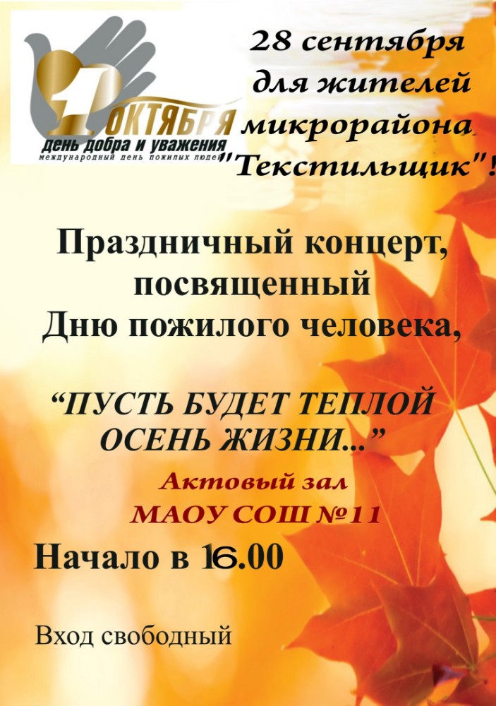 Так, на один из таких приглашает Совет микрорайона «Текстильщик». Жителей микрорайона ждут на праздничный концерт «Пусть будет тёплой осень жизни...», посвящённый Дню пожилого человека.
