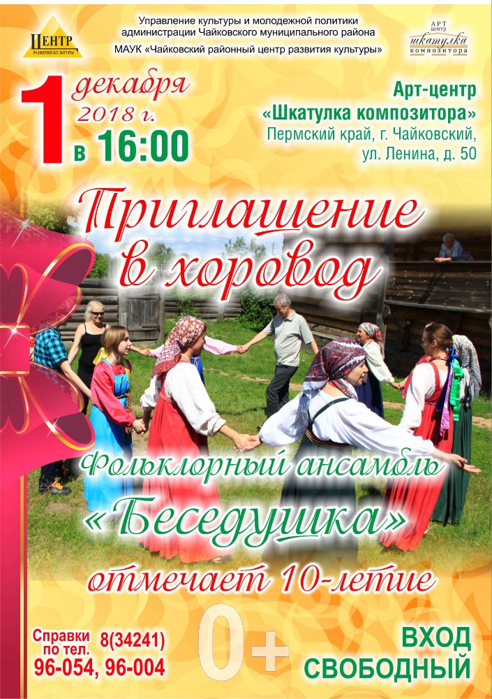 Всех поклонников фольклорного ансамбля «Беседушка» и просто любителей народного творчества ждут 1 декабря в Арт-центре «Шкатулка композитора» на творческой встрече «Приглашение в хоровод». Начало в 16.00.
