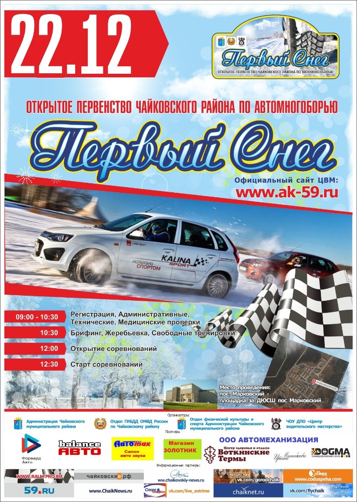 Не прошло и месяца, а организаторы турнира вновь приглашают любителей быстрой езды принять участие в первенстве Чайковского района по автомобильному многоборью «Первый снег - 2». К участию приглашаются водители, достигшие 18-ти летнего возраста, и имеющие действующее водительское удостоверение на право управления транспортным средством категории В.