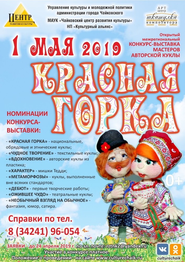 1 мая в Арт-центре «Шкатулка композитора» состоится Открытый межрегиональный конкурс-выставка мастеров авторской куклы «Красная горка». Организаторы приглашают рукодельниц и мастеров поделиться своим творчеством с жителями и гостями города Чайковский.