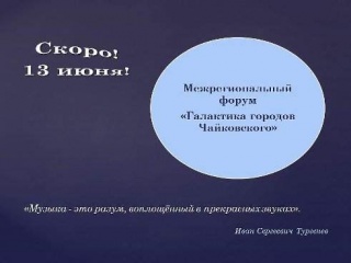 13 июня в Чайковском состоится Межрегиональный форум. Форум проводится в рамках подготовки к 175-летию П. И. Чайковского, реализации межрегионального проекта «Галактика городов П. И. Чайковского» и проекта «Музыкальное содружество» - победителя конкурса социальных и культурных проектов ООО «Лукойл-Пермь».