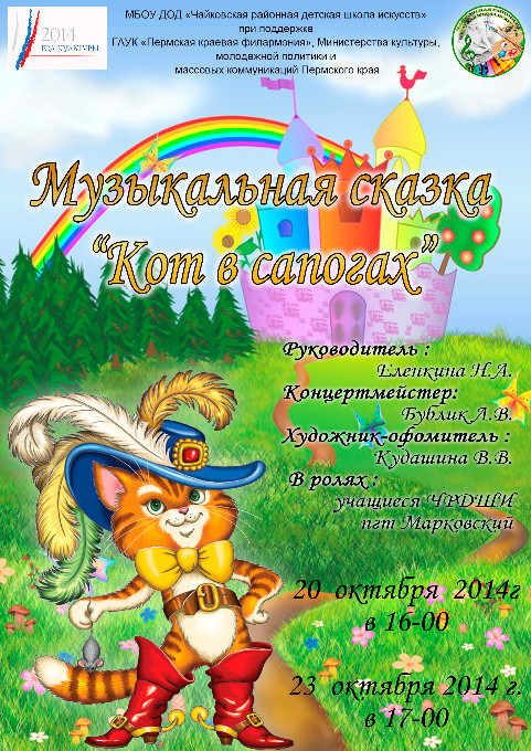 «Кот в сапогах» замечательная сказка для людей различных возрастов и социального положения. Напомним, что в январе 2014 года Пермской краевой филармонией, был объявлен конкурс культурно-образовательных проектов по развитию детских музыкальных школ, детских школ искусств, учреждений среднего специального и высшего профессионального образования сферы искусства и культуры. Одним из победителей в направлении «Школа искусств, музыкальная школа – творческая лаборатория» был признан Проект МБОУ ДОД «Чайковская районная ДШИ» - «Музыкальная мастерская «Сказка». Именно в рамках этого проекта и будет проходить показ спектакля. Он станет заключительным звеном в ряде мероприятий проекта. В течении всего года ребята посещали различные мастер-классы, получили возможность съездить в Чайковский Театр Драмы и Комедии, а также в Чайковское музыкальное училище.