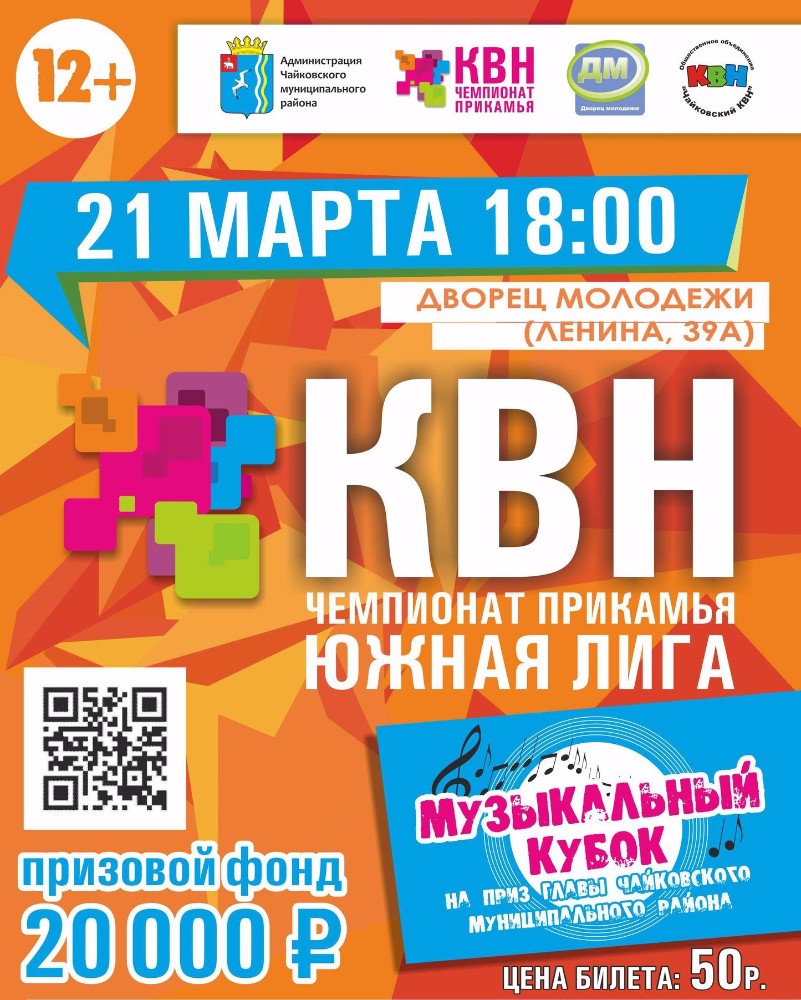21 марта в 18.00 во Дворце молодежи команды КВН Прикамья и Удмуртии поборются за Музыкальный Кубок Южной лиги на приз главы администрации Чайковского муниципального района.