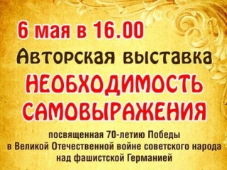 6 мая в 16.00 в выставочном зале МАУК «Чайковский районный центр развития культуры» состоится открытие выставки мастера деревообработки Сергея Ложкина «Необходимость самовыражения». Экспозиция посвящена 70-летию Победы в Великой Отечественной войне.