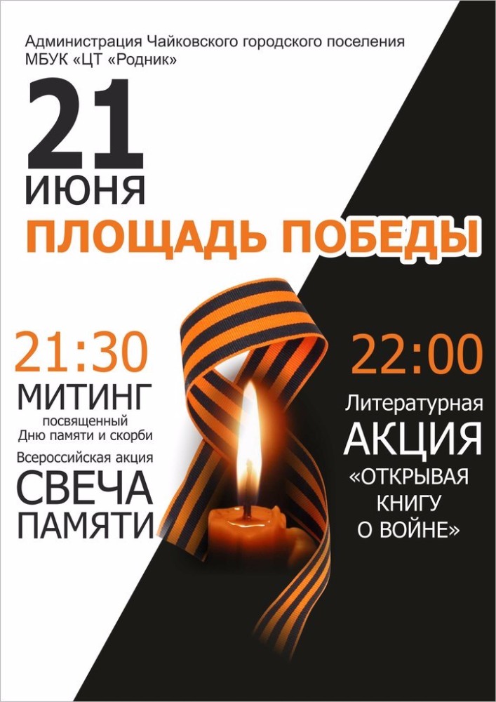 Мероприятия, приуроченные ко Дню памяти и скорби стартуют 21 июня в 21.30 у Вечного огня. Здесь состоится митинг, а также в рамках всероссийской акции «Свеча памяти» сотни чайковцев зажгут свечи в память о воинах, павших в годы Великой Отечественной войны. Ежегодно акция привлекает множество участников самого разного возраста, начиная от самых маленьких, которые зажигают свечи вместе с родителями. Если вы ни разу не участвовали в «Свече памяти» предлагаем вспомнить, как это было в 2013 году.