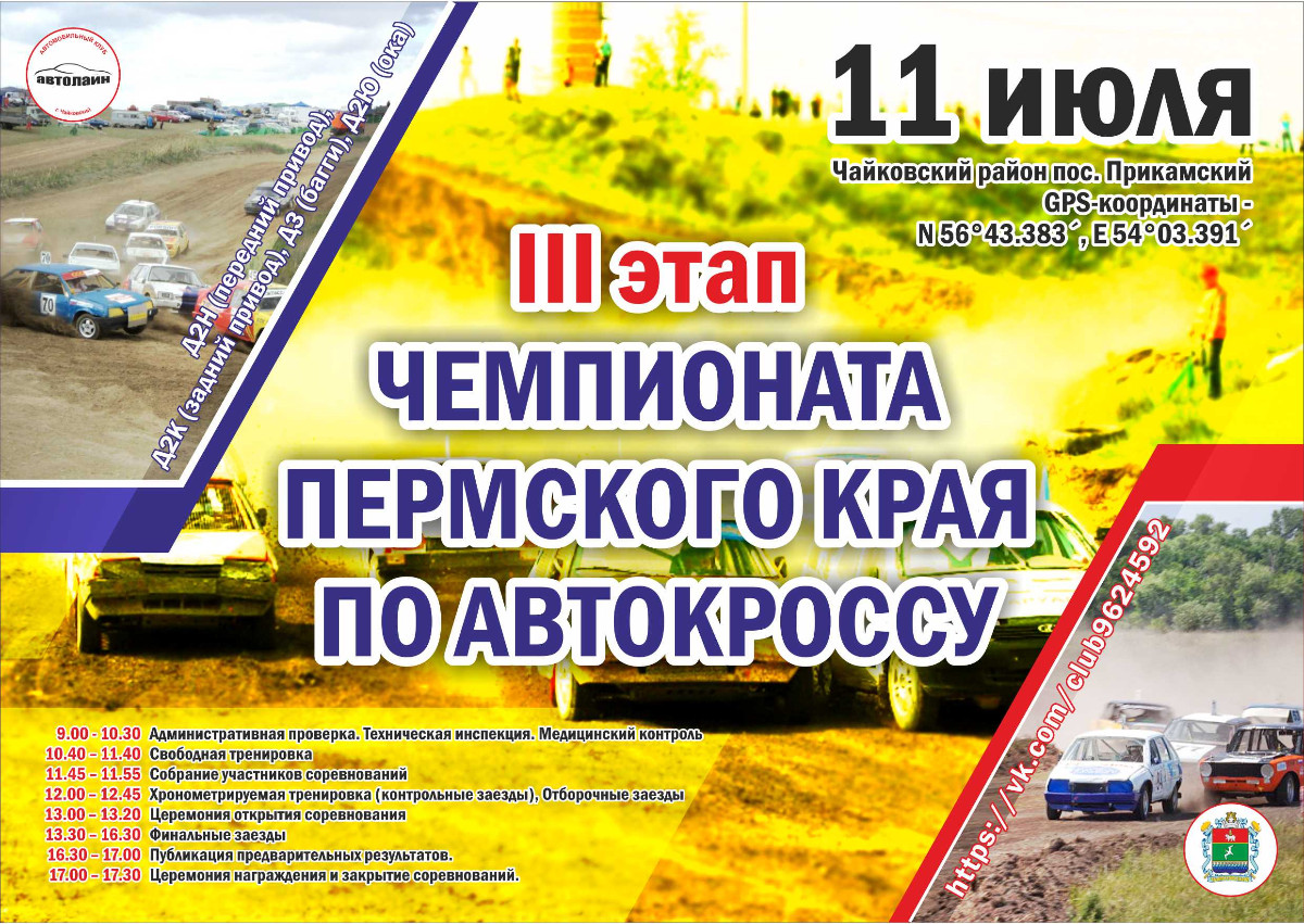 В субботу, 11 июля, в пос. Прикамский Чайковского района состоится 3 этап Чемпионата Пермского края по автокроссу. В соревнованиях примут участие спортсмены от 12 лет. Автосостязания будут проходить в классах Д2Н (передний привод), Д2К (задний привод), Д3 (багги), Д2Ю (ока).