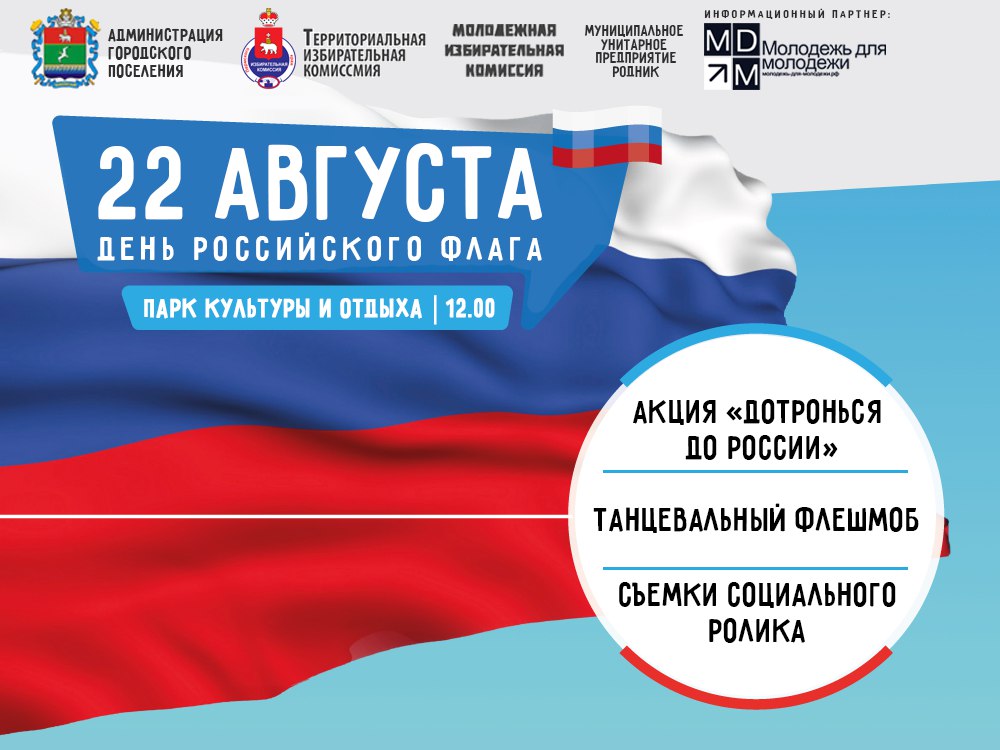 Организаторы приглашают всех жителей города в субботу, 22 августа, в Парк культуры и отдыха на семейный праздник, посвящённый Дню российского триколора. В программе: акция «Дотронься до России», танцевальный флешмоб, а также состоится съёмка социального ролика. Начало мероприятия в 12.00.