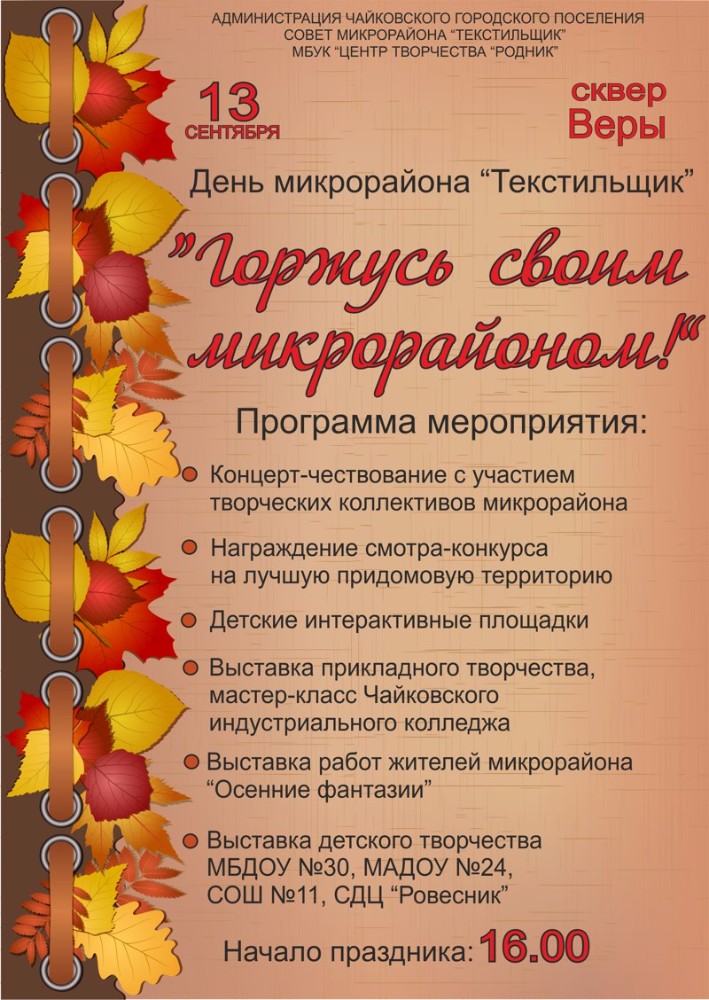 13 сентября в 16.00 в сквере Веры начнется концерт-чествование, посвященный Дню микрорайона «Текстильщик». В праздничной программе примут участие творческие коллективы микрорайона.
