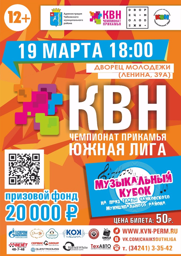 Уже в ближайшую субботу, 19 марта, в 18:00 во Дворце молодёжи пройдёт вечер юмора, а именно Музыкальный кубок КВН Южной лиги на приз главы Чайковского муниципального района. Как сообщают организаторы, на кону стоит и призовой фонд – 20 тысяч рублей.