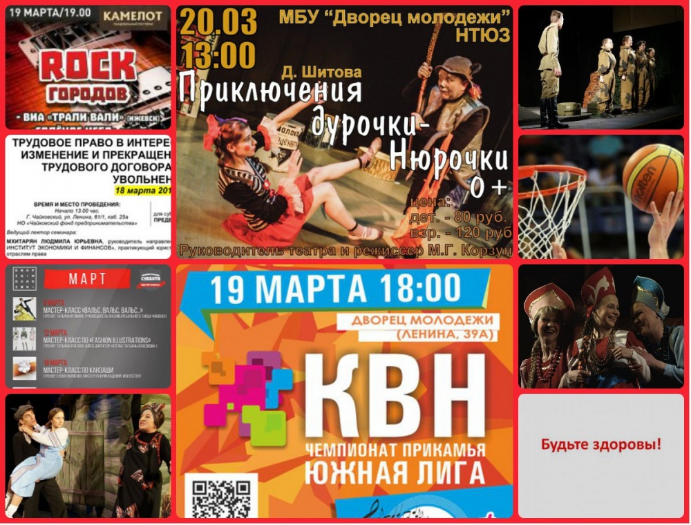 Во Дворце молодёжи продолжаются «Занимательные субботы». В эту субботу в 15:00 рукодельниц ждёт мастер-класс по «Канзаши» (японские традиционные женские украшения для волос). В 18:00 на юмористическом ринге сойдутся КВН-щики в борьбе за музыкальный кубок КВН Южной лиги.
