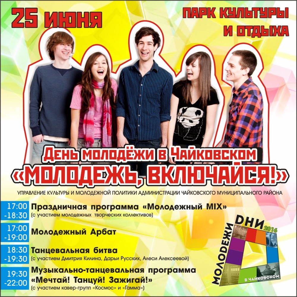 17:00 до 18:30 пройдёт праздничная программа «Молодёжный MIX» с участием молодёжных творческих коллективов. Затем гости могут прогуляться по Молодёжному арбату и поддержать танцоров в танцевальной битве. Завершением праздника станет музыкально-танцевальная программа «Мечтай! Танцуй! Зажигай!».