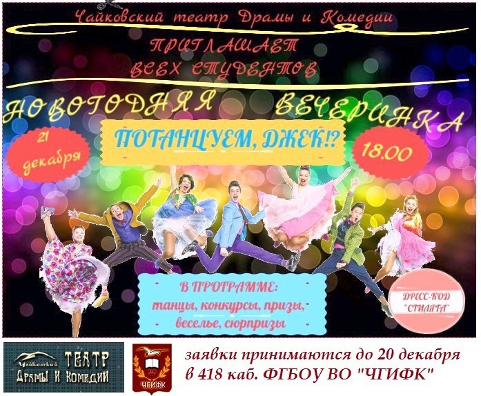 В среду, 21 декабря, в 18:00 Чайковский театр драмы и комедии приглашает студентов города принять участие в праздничной программе «Потанцуем, Джек!?». «В программе множество интересных конкурсов, новых знакомств и танцы «до упаду!», - заявляют организаторы предстоящего мероприятия.