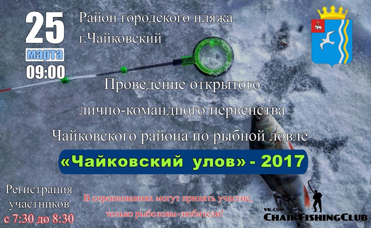 25 марта в районе Чайковского городского пляжа на территории ЦАО «Бухта Южная» состоится открытое лично-командное первенство Чайковского муниципального района по рыбной ловле «Чайковский улов - 2017». К участию в личных и командных соревнованиях допускаются все желающие, жители Чайковского муниципального района, а также рыболовы из соседних регионов, достигшие 14-летнего возраста. В случае, если участнику нет 14 лет, с ним должен быть официальный представитель. Состав участников в командном зачете 2 человека, в номинации «Мормышка». В личном зачёте принимает участие один рыболов, в номинации «Блесна». Участники соревнований должны зарегистрироваться на месте проведения соревнований в установленное время и получить стартовый номер участника в регистрационной комиссии, пакет для улова.