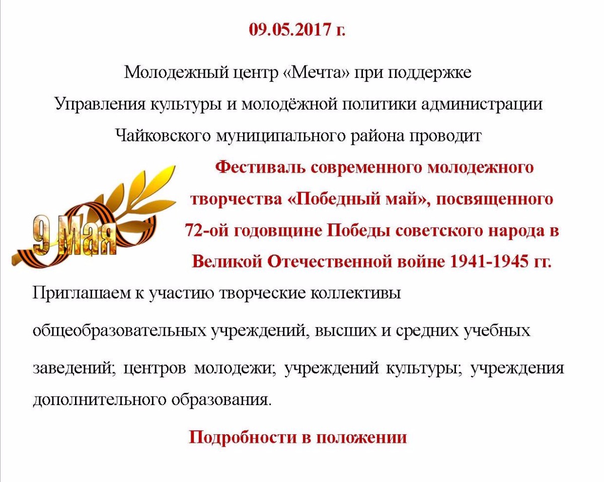 9 мая к многочисленным праздничным мероприятиям, посвящённым Дню победы, добавится и Фестиваль современного молодёжного творчества «Победный май». Организатором фестиваля выступает Молодёжный центр «Мечта».