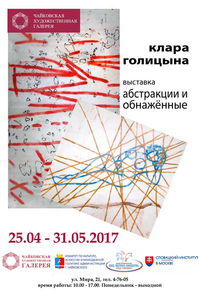 На следующий день, 26 апреля, в 12:00 состоится открытие выставки Клары Голицыной «Абстракции и обнажённые». Клара Голицына одна из тех, кого можно назвать классиком современного русского авангарда. Выставка Клары - уникальный шанс для жителей и гостей города Чайковского познакомиться с творчеством художницы за последние десять лет.
