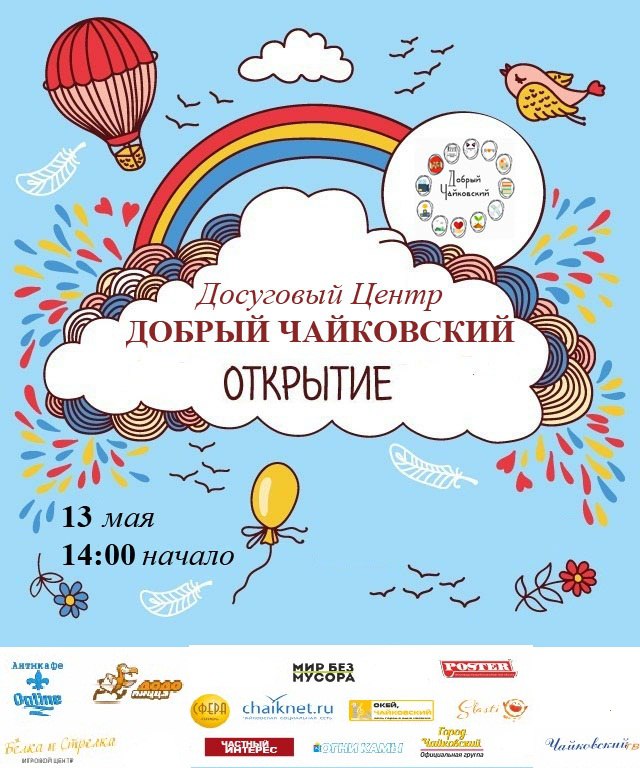 Уже в ближайшую субботу, 13 мая, в Чайковском состоится торжественное открытие Досугового центра «Добрый Чайковский». Гостей ждут розыгрыши подарков, конкурсы, игры, концертная программа, а также мастер-классы.