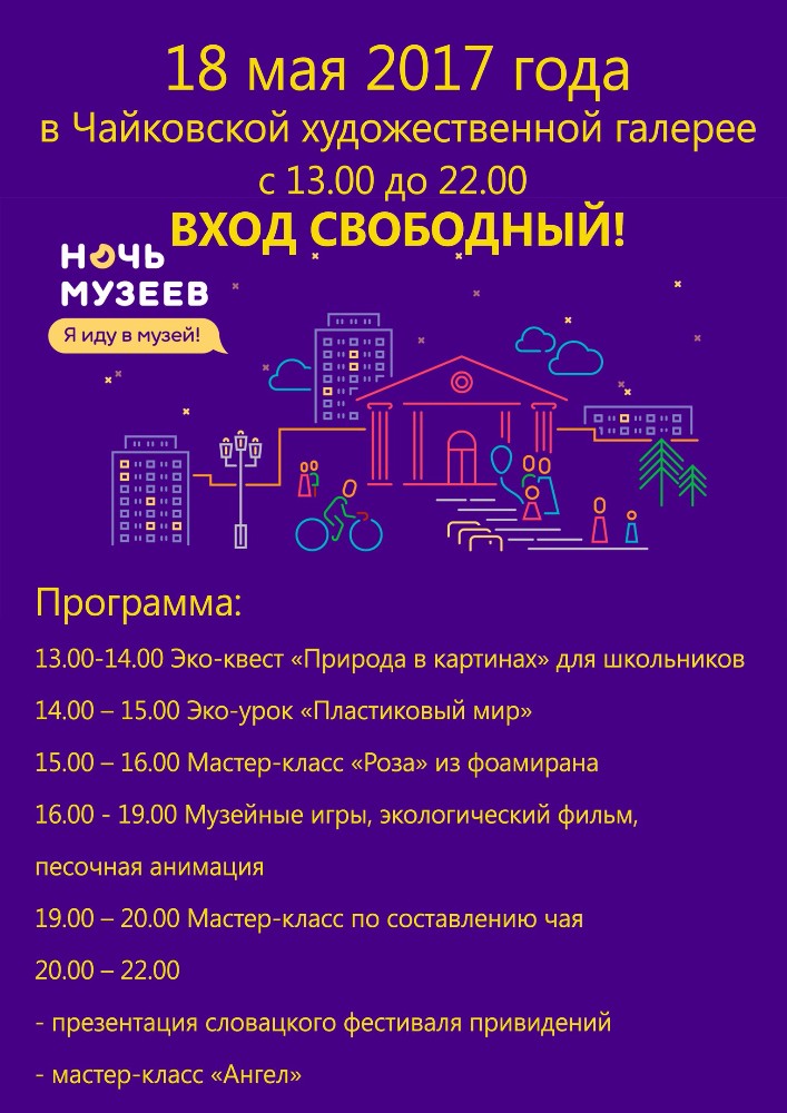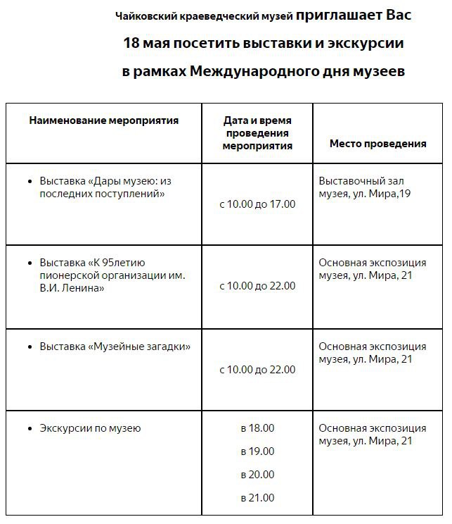 В честь этого события сотрудники Чайковского краеведческого музея приглашают жителей города и района на бесплатные экскурсии по музею. Также можно посетить выставки «Дары музею: из последних поступлений», «К 95-летию пионерской организации им. В.И. Ленина», «Музейные загадки». В рамках Международного дня музеев 18 мая Чайковский краеведческий музей работает с 10:00 до 22:00.