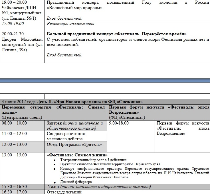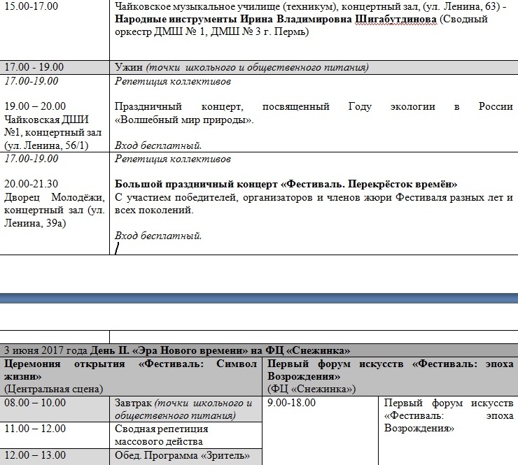 Первый день фестиваля - «Путешествие в Фестивальную эпоху». Участников ожидают мастер-классы, интерактивные выставки, экскурсионно-познавательная программа и большой праздничный концерт «Перекресток времен». День второй - «Эра нового времени» - на площадке Федерального центра подготовки по зимним видам спорта «Снежинка» состоится Первый краевой Форум искусств с участием представителей администраций муниципальных районов (городских округов) Пермского края. Кульминацией станет официальная церемония открытия фестиваля, состоящая из театрализованного массового действа и концерта симфонического оркестра. Площадкой впервые выступит ФСК «Снежинка».