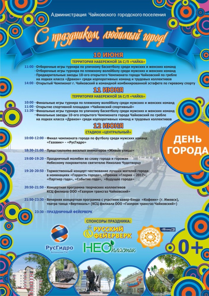 С 10 по 12 июня в преддверии главного общегородского праздника, посвящённого Дню города и Дню России, в Чайковском пройдёт немало интересных мероприятий, которые рассчитаны на жителей всех возрастов. В этом году основные мероприятия по-традиции пройдут на набережной за санаторием-профилакторием «Чайка» и стадионе «Центральный».