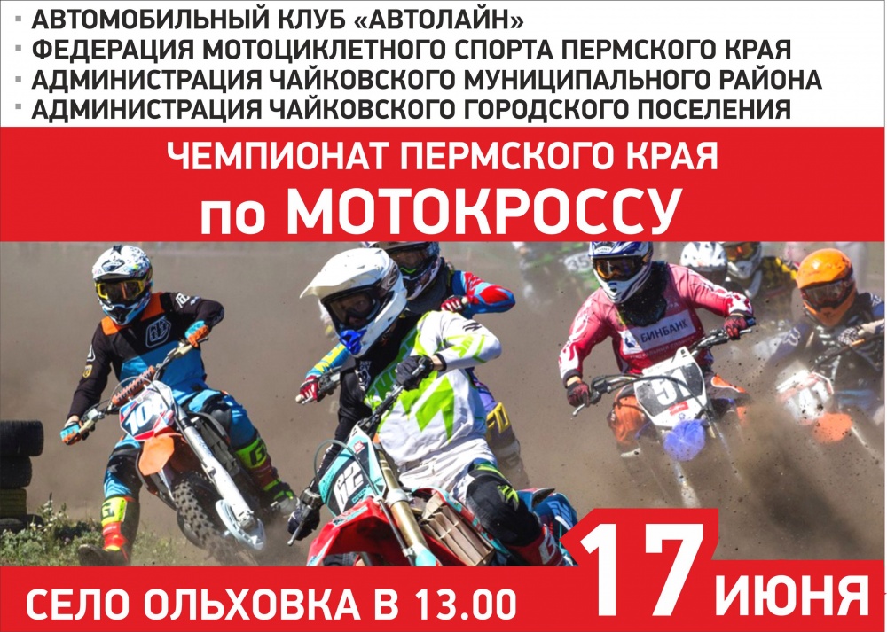 В субботу, 17 июня, автомобильный клуб «Автолайн» приглашает жителей и гостей Чайковского на 4-й этап чемпионата Пермского края и Первенство по мотоциклетному кроссу. В мотосостязаниях примут участие дети от 8 лет, юноши и мужчины из Чайковского, Пермского края, а также близлежащих регионов.
