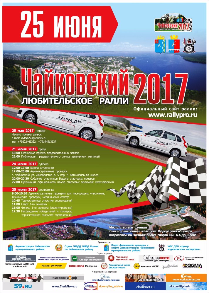 25 июня на территории Чайковского района и города Чайковский впервые состоится любительское ралли «Чайковский-2017». На сегодняшний день для участия в ралли заявились экипажи из Перми, Чайковского, Ижевска, Новоуральска.