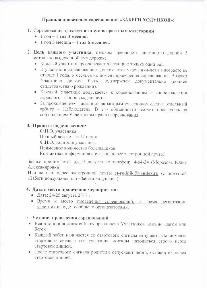Заявки на участие принимаются до 15 августа на электронный адрес ct-rodnik@yandex.ru с пометкой «Парад колясок», «Забеги ползунков» или «Забеги ходунков». Справки по телефону 4-64-34 (Морозова Юлия Александровна).