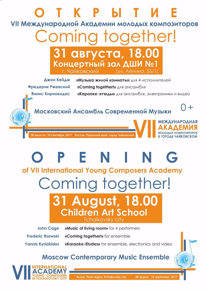 В программе выступления Московского ансамбля современной музыки: Джон Кейдж. «Музыка жилой комнаты» для 4 исполнителей, Фредерик Ржевский. «Coming together!» для ансамбля, Яннис Кириакиде. «Караоке-этюды» для ансамбля, электроники и видео.