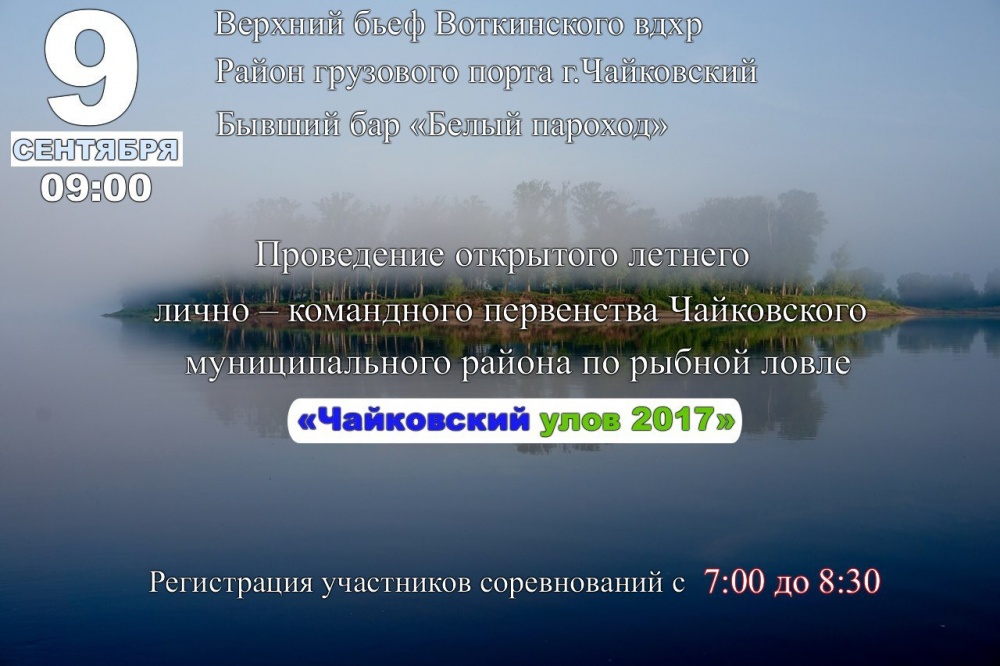9 сентября на реке Кама в районе грузового порта будет проходить Открытое летнее лично-командное первенство по рыбной ловле «Чайковский улов - 2017». Главный судья соревнований – Смирнов А.В.