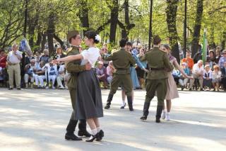 Танцевальные пары, одетые в стиле военных лет, будут вальсировать, как когда-то в далеком 1945-м 9 мая кружились в праздничном вальсе наши бабушки и дедушки.