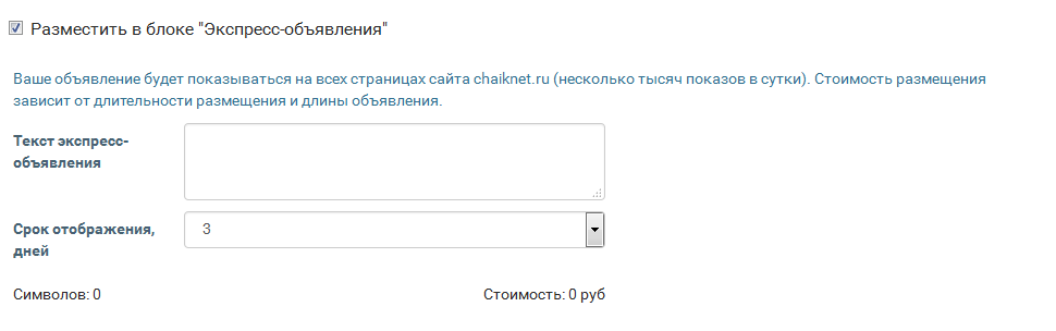 Разместить объявление в блоке «Экспресс-объявления» легко: достаточно выбрать опцию «Разместить в блоке «Экспресс-объявления» при добавлении объявления на доске объявлений Chaiknet.ru. Стоимость размещения экспресс-объявления зависит от длины объявления и срока размещения (минимум 3 дня).