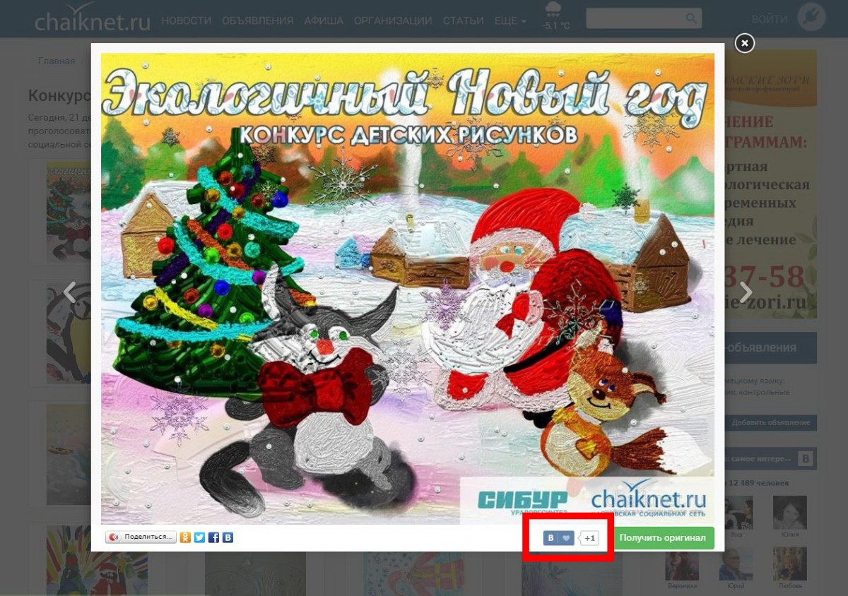 Каждая из них, несомненно, прекрасна, так как каждый ребенок старался и думал о том, как провести самый ожидаемый праздник с заботой об экологии. Мы не стали делить рисунки на возрастные категории или какие-либо номинации. Мы просто предлагаем вам выбрать наиболее интересные по вашему мнению работы, загруженные в конкурсный фотоальбом, и проголосовать за них, нажав кнопку «Мне нравится». Для того, чтобы она не осталась без вашего внимания, мы выделили ее красным цветом на скриншоте.